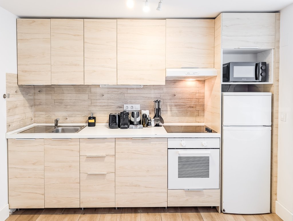 The apartment features a functional open-plan layout with a bright dining area, a comfortable sofa, and a Smart TV, creating a welcoming living space perfect for relaxing after work or exploring the city. The kitchen and living area flow naturally, making the space practical and enjoyable for longer stays.